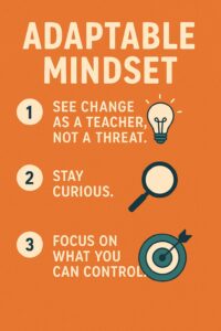 • Strengthen your emotional resilience. Learn to control yourself under pressure – deep breaths, quick breaks, writing things down or talking with a mentor. A calm mind adapts faster.